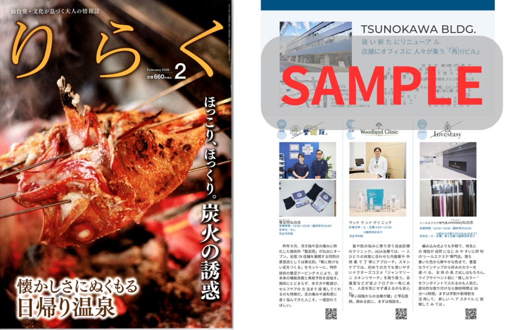仙台経済界2026年1-2月号(69ページ)、「新しい自分に出会える3店舗に注目」という記事において当クリニックが掲載されました。