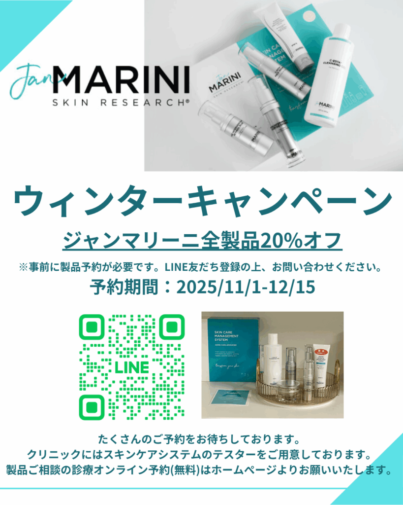 ジャンマリーニスキンリサーチ製品が期間限定で20%オフ! 2025 11/16 ウィンターキャンペーン実施中です!化粧品でお悩みの方は是非、この機会にドクターズコスメのご利用をご検討していただけると幸いです。LINEチャットよりたくさんのご予約をお待ちしております。 お知らせ